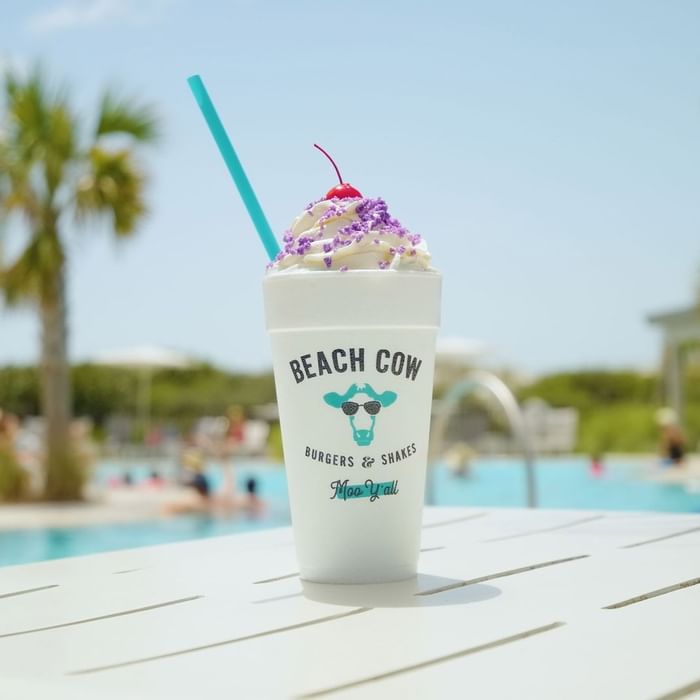 This Southern burgers and shakes bar is all about fun in the sun and delicious fast, casual fare. Beach Cow is a walk-up counter with window service, located on the lower pool deck at WaterColor Beach Club. It’s perfect for grabbing build-your-own burgers and made-to-order milkshakes with several flavors and toppings to enjoy while you’re lounging by the pool, heading to the beach, or coming back from a day of playing in the surf and sand. Part of an extensive renovation at the beach club, Beach Cow fills the need for a quick and casual dining stop with hot snacks and cool treats that guests are sure to love.